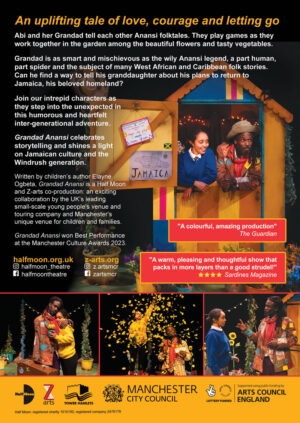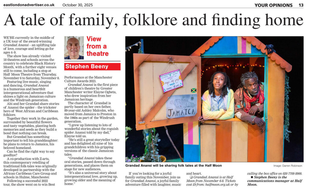 Written by award-winning children’s author Elayne Ogbeta, Grandad Anansi was a co-production from Half Moon and Z-arts, the award-winning team behind Dust, winner of the 2022 Off West End Theatre Award for Best Theatre for Children Aged 5-11.