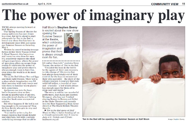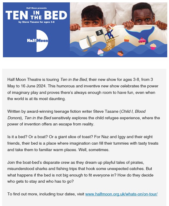 We’re always moving forward at Half Moon. Our Spring Season of theatre for young audiences has just drawn to a close, but we’re about to start rehearsals for Ten in the Bed, a brand new show that has been in development since 2021 and opens our Summer Season on Saturday 4 May.