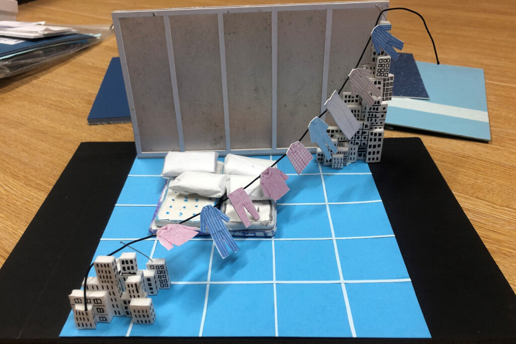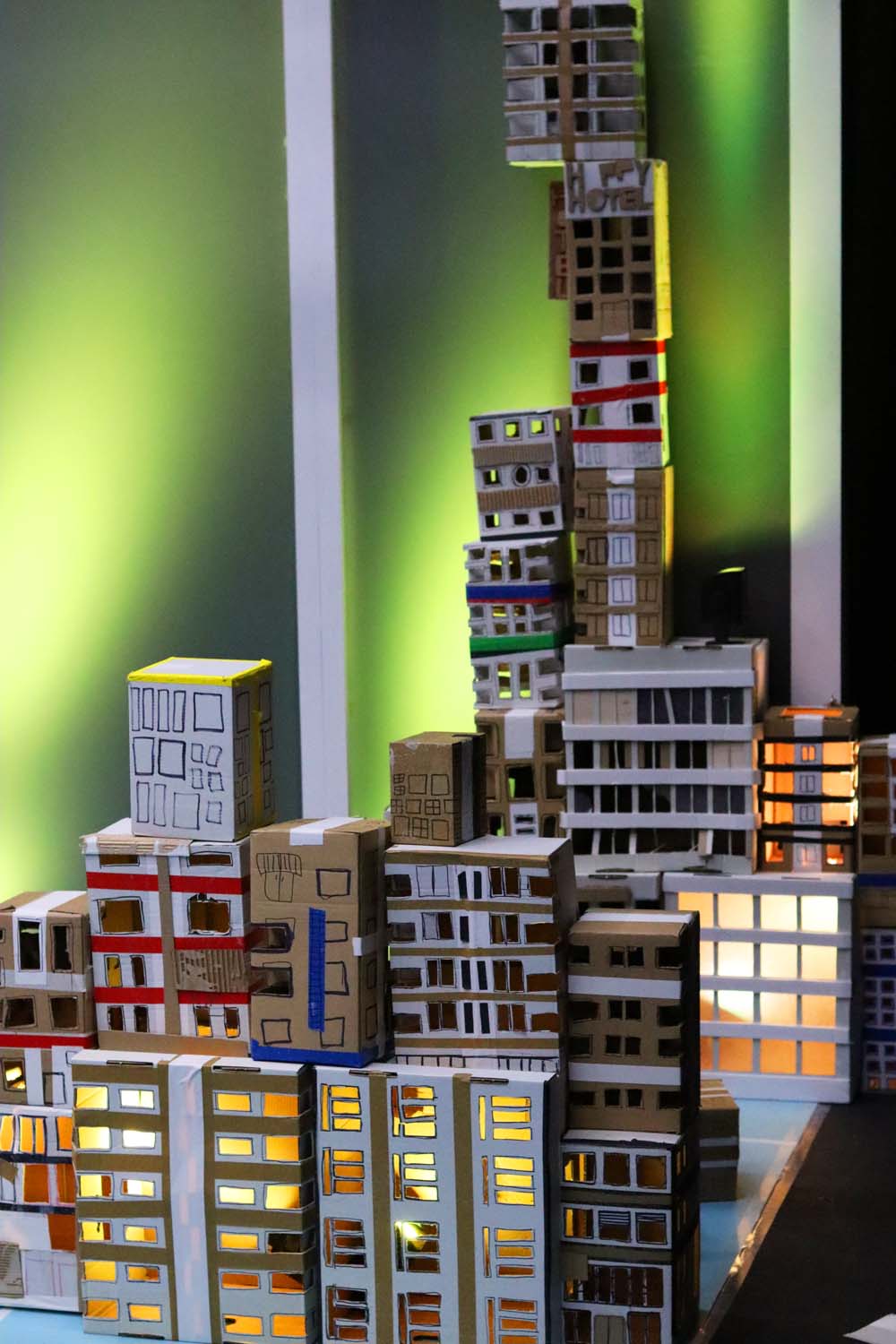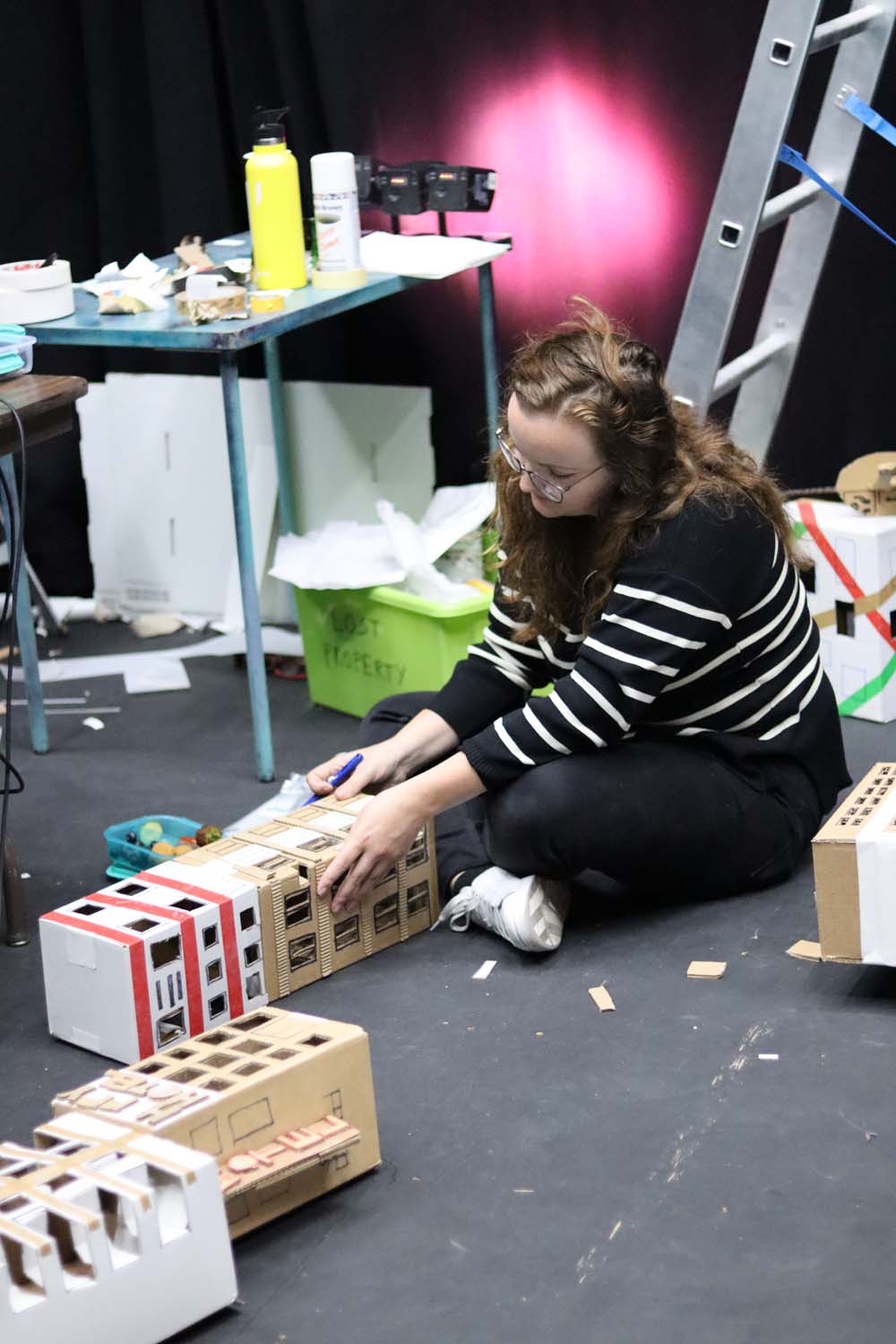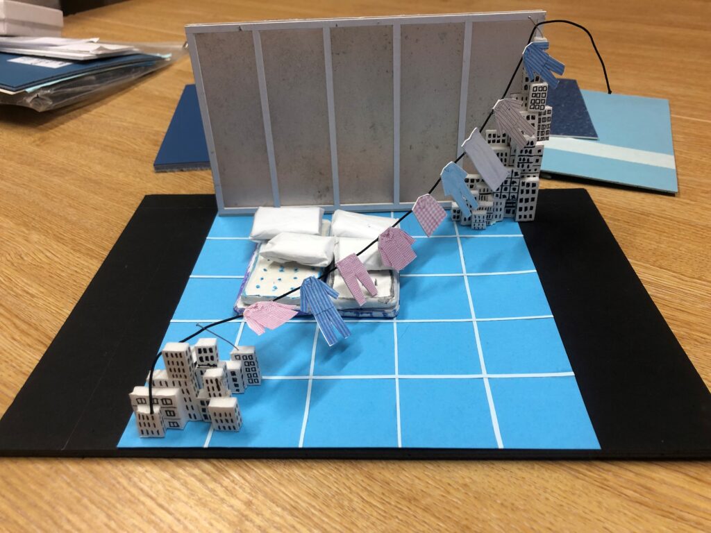 The therapy house boxes that feature in the design were made by the members of Half Moon’s Orbit and Lunar Youth Theatres.