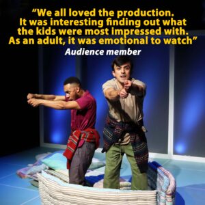 “One of the best shows I have seen; our classes were both excited and captivated by the creative imaginative play of the actors as well as seeing a sensitive portrayal of the hardship other children experience – it totally tapped into the need for my children to explore empathy towards others – and I found it beautifully moving too. Thank you.”