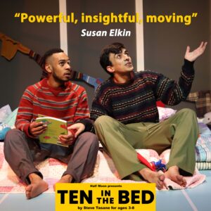 ⭐️⭐️⭐️⭐️⭐️ “Went to see Ten in the Bed today and was completely blown away. My 4-year-old and not even 2-year-old were captivated the whole way through. It was funny and poignant and the acting was brilliantly expressive and physical to help kids follow the dialogue. I want all my friends to take their kids to see it but it’s only on this week! The theatre staff themselves were very welcoming. We’ll be back!”